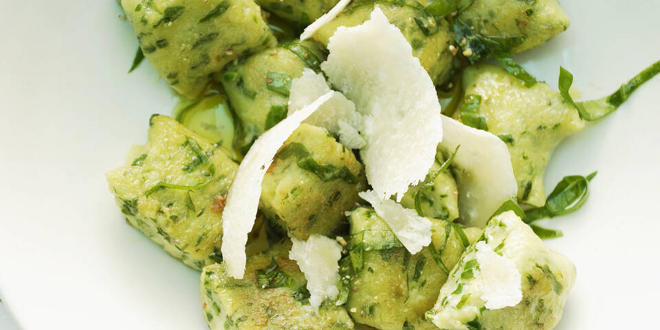 - Den Bärlauch waschen, trocken schütteln und fein hacken. Davon etwa zwei EL zur Seite legen. Etwa die Hälfte vom Parmesan fein reiben. Den Bärlauch mit dem Ricotta, den Dottern, Mehl und geriebenem Parmesan zu einem Teig kneten und mit Salz und Pfeffer würzen. Anschließend in vier Stücke teilen und jeweils auf bemehlter Arbeitsfläche zu ca. zwei einhalb cm dicken Rollen formen.
