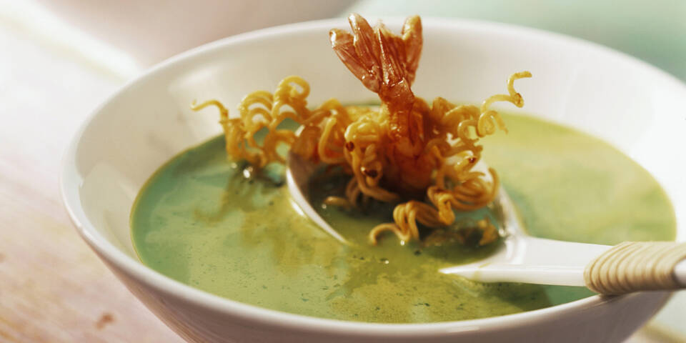 - Das Pflanzenöl in der Fritteuse auf ca. 170 °C erhitzen. Die Garnelen mithilfe einer Gabel erst in das Eiklar tauchen, etwas abtropfen lassen, danach in den Nudelstücken wenden und im Fett goldgelb frittieren. Auf Küchenpapier abtropfen lassen. Die Suppe auf Teller verteilen und mit frittierten Garnelen servieren.