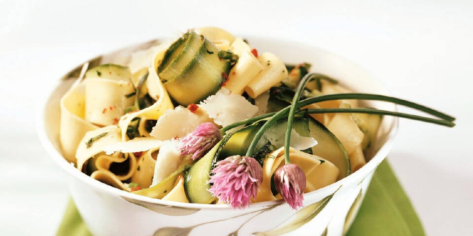 - In tiefen Tellern anrichten und mit Parmesan sowie rosa Pfefferbeeren bestreut servieren. Nach Belieben mit Schnittlauchblüten garnieren.