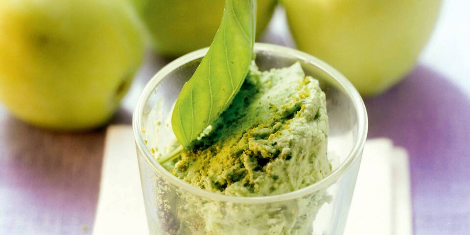- Dann vom Herd ziehen und abkühlen lassen. Das Basilikum waschen, trocken schütteln und die Blättchen abzupfen. Die Apfelstücke samt der Flüssigkeit mit dem Zitronensaft, den Basilikumblättchen, 2 EL Pistazien, dem Zucker und dem Vanillezucker fein pürieren.