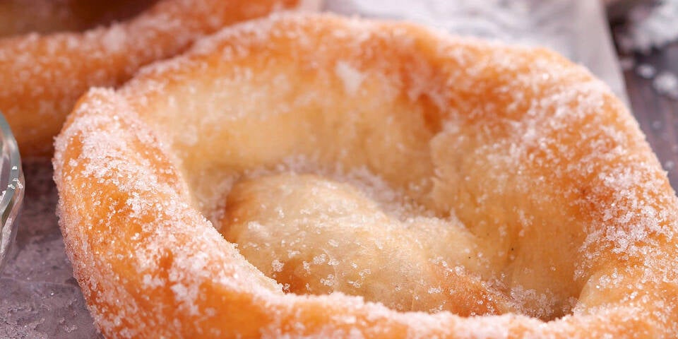 - Anschließend mit in Butter getauchten Fingern ausziehen, dabei den Teigrand durch die Hand gleiten lassen, so dass in der Mitte ein dünnes Fenster entsteht. Die Küchlein in das heiße Schmalz (ca. 170 °C) gleiten lassen und portionsweise ausbacken. Gut abtropfen lassen und noch heiß in Zucker wenden. Sofort servieren.