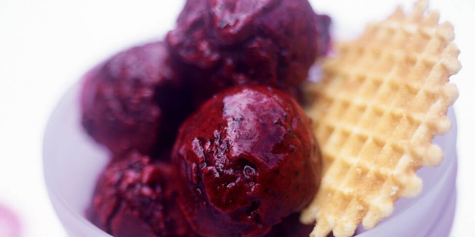 Die gefrorenen Beeren in einen hohen Becher füllen. Den Staubzucker und das Obers zufügen. Anschließend mit dem Pürierstab fein pürieren. Das Eis zu Nocken abstechen und auf Schälchen verteilen. Nach Belieben mit einer Waffel kalt servieren.