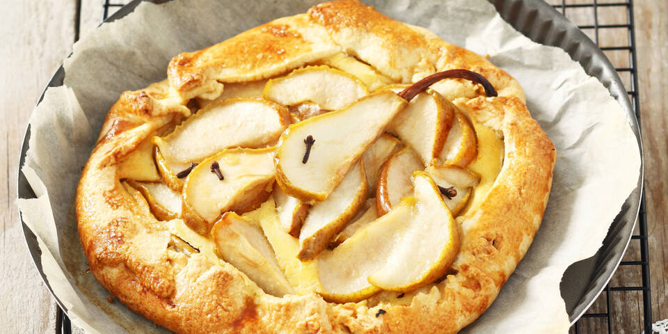 - Den Backofen auf 180 °C Umluft vorheizen. Die Tarteform mit Backpapier auslegen. Die Birnen waschen, halbieren, das Kerngehäuse herausschneiden und in feine Spalten schneiden. In eine Schüssel geben, den Zitronensaft, die Nelken, den Schnaps und den Staubzucker untermengen.