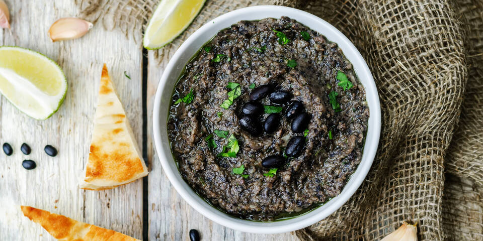 2. Den Black-Bean-Hummus mit Salz und Pfeffer würzen und nach Belieben mit Knoblauch und/oder mehr Olivenöl verfeinert servieren.