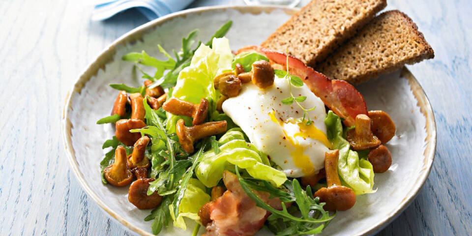 - Eierschwammerl putzen, Salate waschen, schneiden. 1 l Wasser zum Sieden bringen. Eier einzeln in eine Tasse aufschlagen, in das Wasser gleiten lassen und mit einem Esslöffel in eine runde Form bringen – Eiweiß muss Eigelb umschließen – 4 Min. pochieren.
