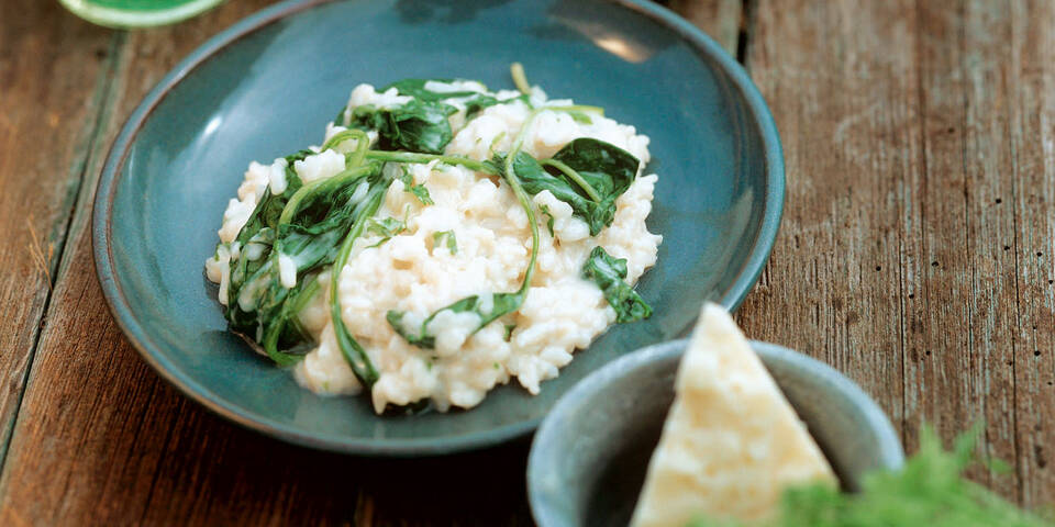 - Butter und Parmesan einrühren, dann noch mit Salz und Pfeffer abschmecken. Spinat unterheben und servieren.