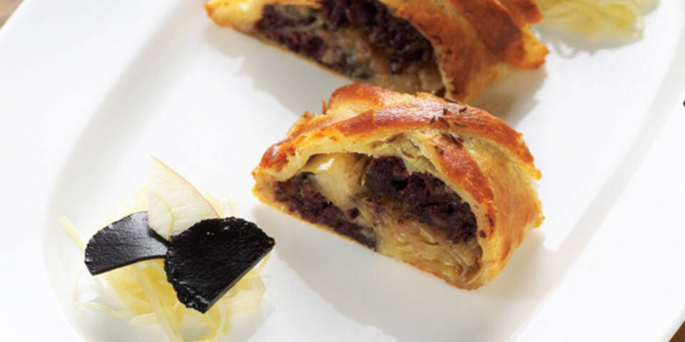 Teig etwa 1 cm dick ausrollen. In so große Stücke schneiden, dass man die Würste mit gut überlappendem Teig einschlagen kann. Würste auf die Teigstücke legen, Teig rund um die Würste mit verquirltem Ei bestreichen. Würste in Teig einschlagen, Teigenden gut zusammendrücken. Würste so auf ein mit Backtrennpapier belegtes Blech setzen, dass die Seite, an welcher der Teig überlappt, unten ist. Teigreste in zirka 1 cm breite Streifen schneiden und die Blutwurstpäckchen damit dekorieren. Teig mit Ei bestreichen und mit Kümmel bestreuen. Würste im Teig im Backrohr bei 220 °C zirka 25 Minuten backen. Gebackene Blutwürste mit Rettich servieren. Sehr gut passen auch kräftige Salate wie Radicchio oder Rucola dazu.
