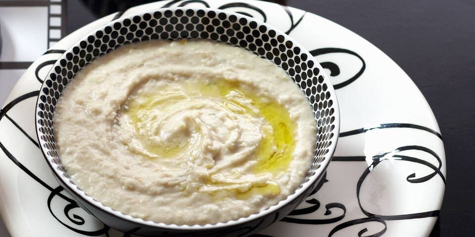- Zum Schluss die Bohnen fein pürieren, Crème fraîche, Anchovis, zwei Esslöffel Öl und so viel Fond unterrühren, bis ein sämiges Püree entsteht. Mit Salz und Pfeffer abschmecken, in ein Schälchen füllen und mit dem restlichen Olivenöl beträufeln. Mit Gemüsestiften zum Dippen servieren.