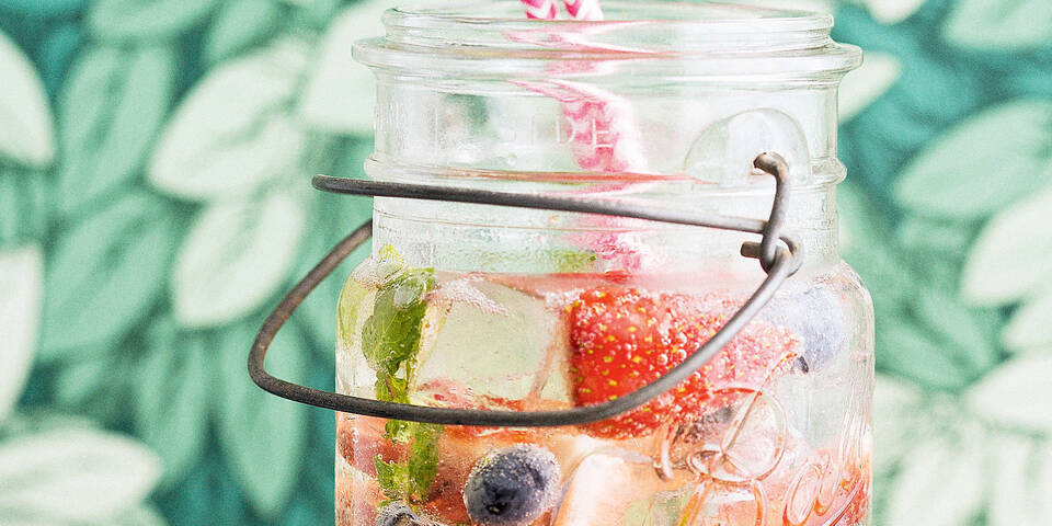 - Die Minze abbrausen, trocken schütteln, die Blätter abzupfen und zusammen mit den Beeren und den Granatapfelkernen gleichmäßig auf 4 Gläser verteilen. Mit einem Stößel leicht andrücken. Die übrigen Eiswürfel, den Tee und den Bourbon darüber gießen, mit Limonade auffüllen, alles kurz verrühren und servieren.