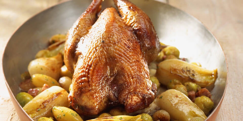 - Den Chicorée und die Kohlsprossen putzen und waschen. Die Zwiebeln und Schalotten schälen. Den Speck in Streifen schneiden. Die vorbereiteten Zutaten in einer ofenfesten Stielkasserolle in 1 EL heißer Butter goldbraun anbraten. Mit Puderzucker bestreuen und leicht karamellisieren lassen. Den Wein und etwas Fond angießen.