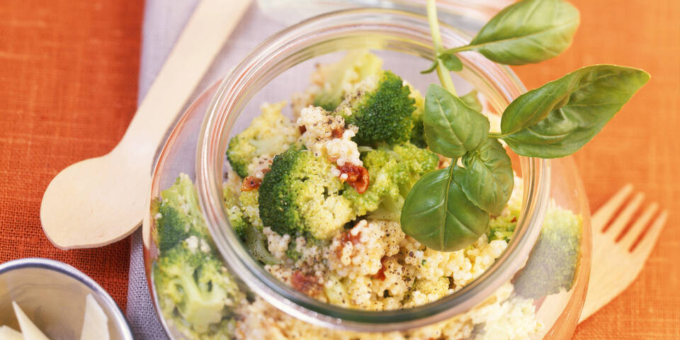 - Brokkoli abbrausen, putzen und in Salzwasser 5–6 Minuten blanchieren. Abschrecken und gut abtropfen lassen. Die Paradeiser gut abtropfen lassen und hacken.