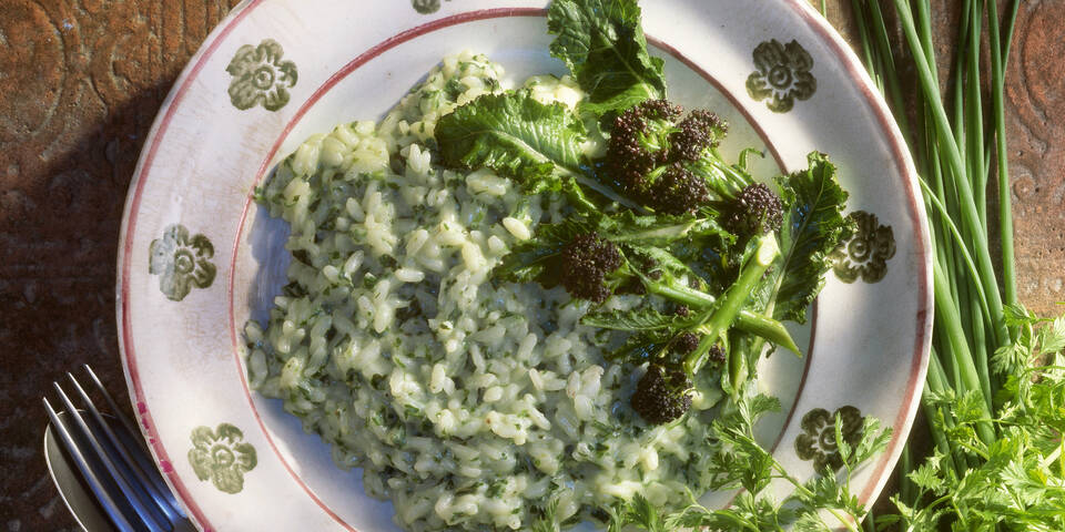 - Zum Schluss den Käse, die übrige Butter und die Kräuter unter das Risotto mengen. Mit Salz und Pfeffer abschmecken. Das Risotto sofort mit dem Brokkoli auf Tellern verteilen und servieren.