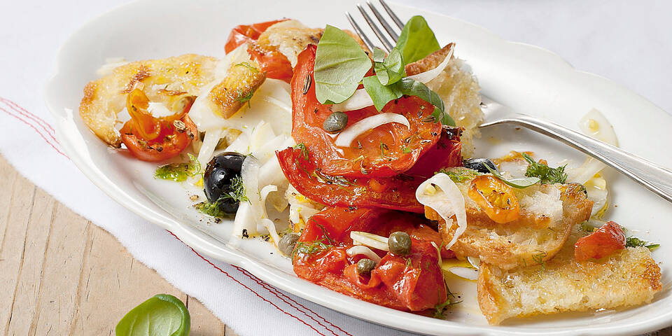 - Das Brot, die Paradeiser und den Fenchel vermengen und auf Platten anrichten. Mit dem Dressing und den pürierten Kräutern beträufeln. Die Oliven und Kapern dazu geben und mit Basilikum garniert servieren.