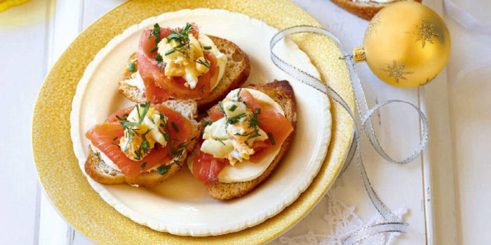 - Jede geröstete Baguettescheibe mit Frischkäse bestreichen, eine Scheibe geräucherten Lachs drauflegen – mit der Ei-Mayonnaise-Mischung und etwas Dill und Schnittlauch garnieren.