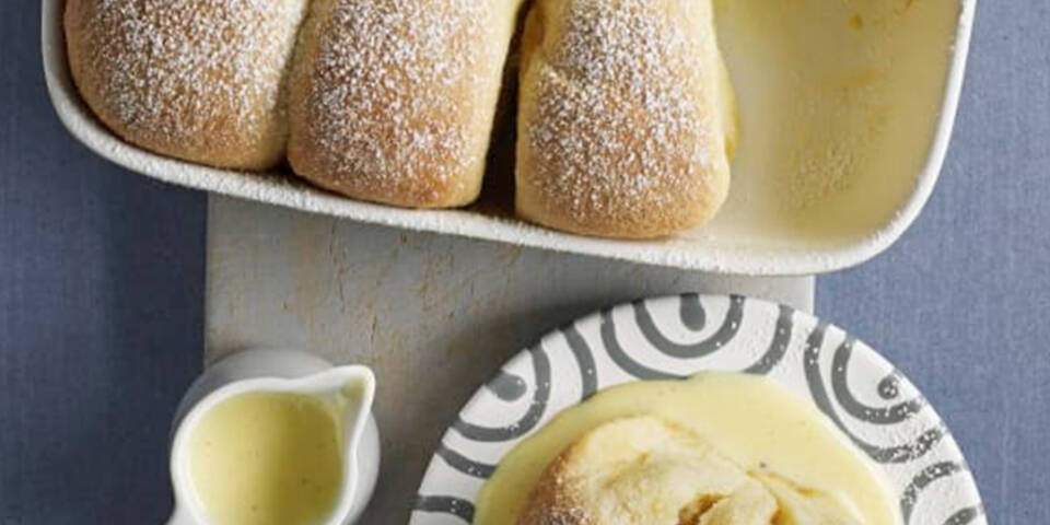 6. Rühraufsatz einsetzen. Zucker, Schlagobers, Milch, Eidotter, Rum und Vanillemark in den Mixtopf geben und 8 Min./80°C/ /Stufe 2 erhitzen. Buchteln mit Staubzucker bestreuen und mit Vanillesauce servieren.
