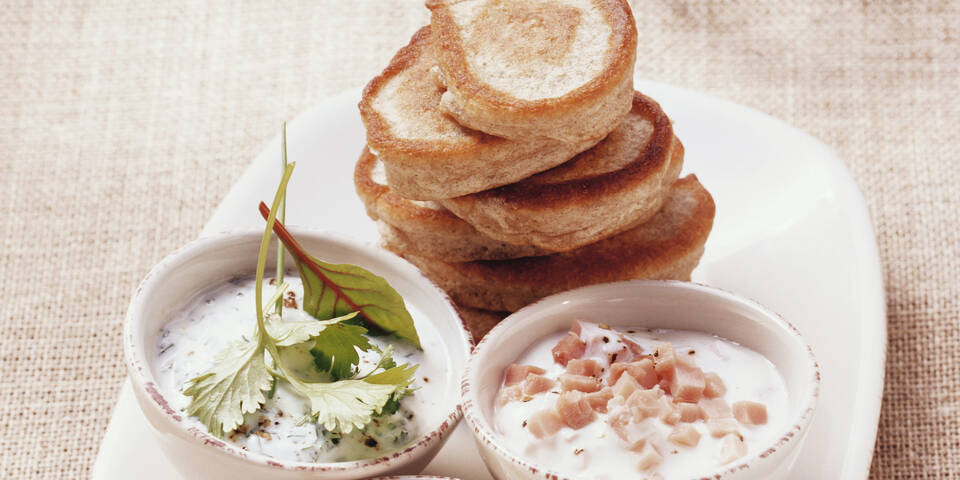 - Die Eiweiße steif schlagen und vor dem Backen unter den Teig ziehen. Etwas Butterschmalz in einer Pfanne erhitzen, mit einem Esslöffel Teighäufchen hineinsetzen und von beiden Seiten jeweils zwei Minuten goldbraun braten und mit den Dips servieren.