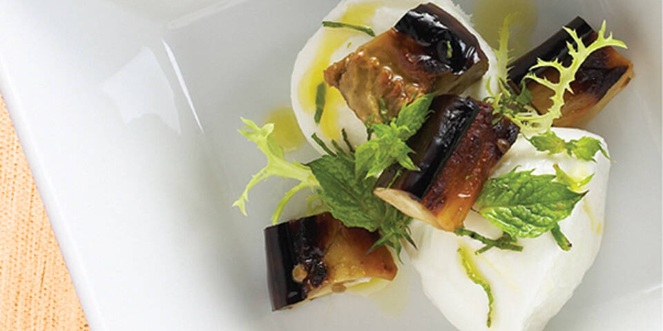 Mozzarella ebenfalls in Würfelschneiden und mit den Melanzaniwürfeln vermischen (kleine Mozzarellas kann man im Ganzen lassen). Mit Salz, Pfeffer, einem kleinen Schuss Balsamicoessig und reichlich Olivenöl marinieren. Minzeblätter von den Stielen zupfen und in feine Streifen schneiden (man benötigt davon zirka 1 EL). Salat mit Minze bestreuen.