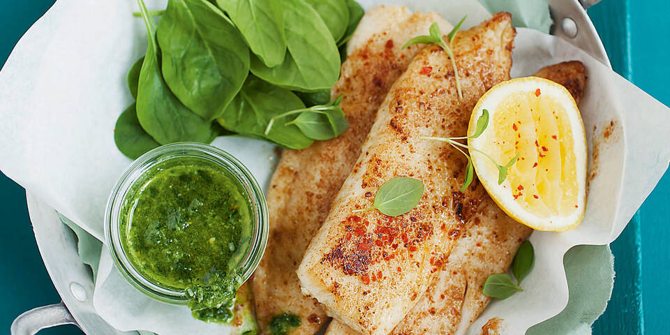 - Die Fischfilets waschen, trocken tupfen und mit Zitronensaft beträufeln. Mit Salz und Pfeffer würzen sowie dünn mit Mehl bestauben. Das Öl in einer Pfanne erhitzen und die Fischfilets auf jeder Seite zwei Minuten goldbraun braten. Die Fische auf Tellern oder einer Platte anrichten, mit Chiliflocken bestreuen und dazu das Pesto reichen. Mit Babyspinat und Zitronenscheiben garniert servieren.
