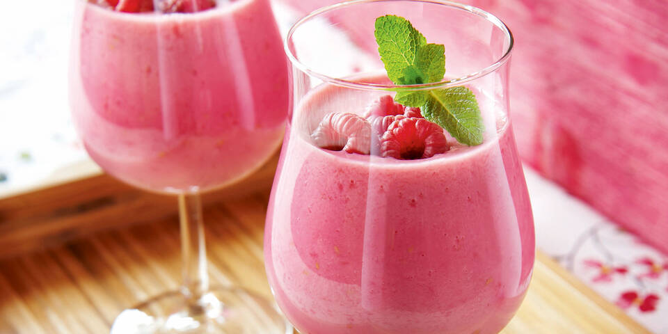 - Die Eiswürfel zugeben, cremig mixen und in 2 Gläser füllen. Mit den restlichen Himbeeren und Minze garniert servieren.