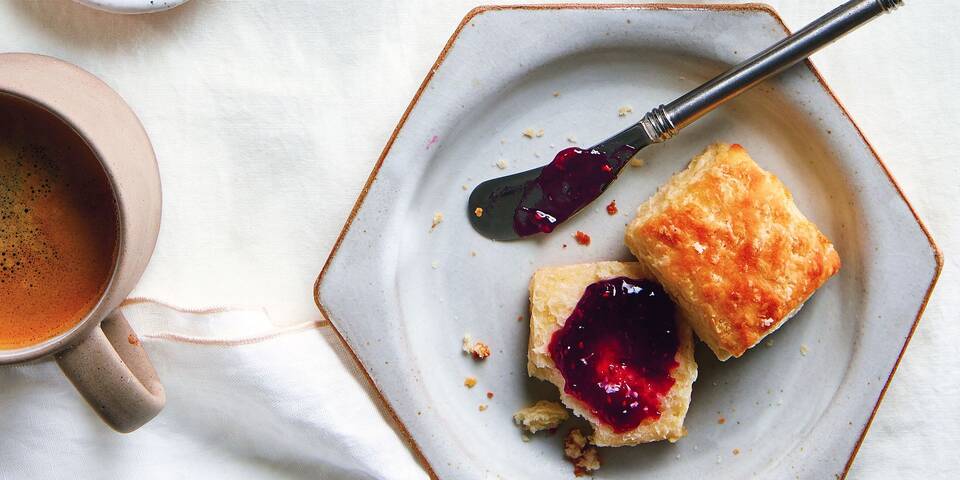 4. Im vorgeheizten Ofen auf der mittleren Schiene 12–15 Min. backen, bis die Scones locker aufgegangen und goldgelb sind. Sofort servieren.