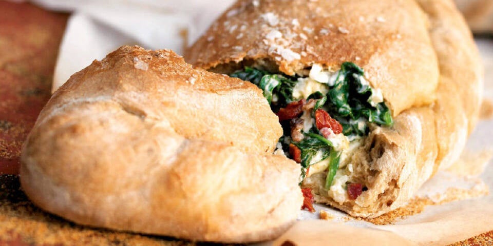 - Den Pizzateig auf bemehlter Arbeitsfläche nochmals gut durchkneten und in vier Stücke teilen. Jedes Stück zu einem etwa tellergroßen Fladen ausrollen. Jeweils mit etwas Olivenöl bestreichen. Den Rand dabei frei lassen. Auf der Mitte einer jeden Teighälfte die Füllung verteilen. Die zweite Teighälfte darüber schlagen und die Ränder gut andrücken. Den Rand Stück für Stück einschlagen, andrücken und auf diese Weise den typisch geriffelten Rand formen.