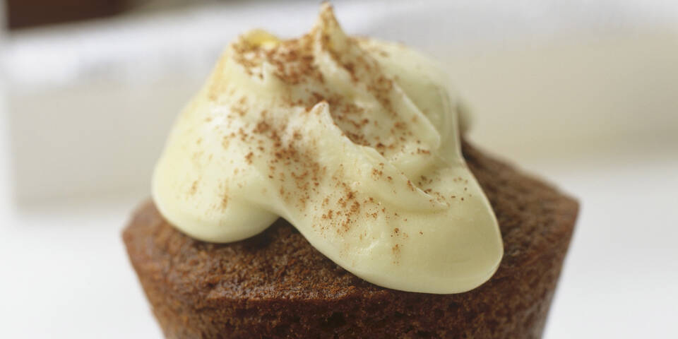 - Papier-Backförmchen ins Muffinblech setzen. Den Teig in die Förmchen füllen und ca. 25–30 Minuten backen. Die Muffins herausnehmen und im Blech etwas abkühlen lassen, dann herausheben und auskühlen lassen. Zum Servieren je einen Teelöffel Mascarponecreme auf die Muffins geben und mit Kakaopulver bestauben.