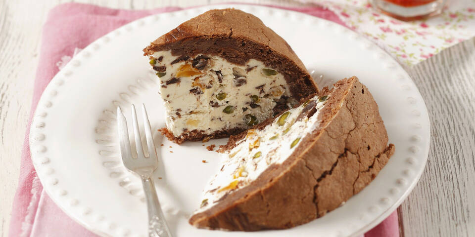 - Mit etwas Likör beträufeln und Creme einfüllen, glatt streichen, den runden Boden darauf geben und mit restlichem Likör beträufeln. Mindestens vier Stunden im Gefrierfach anfrieren lassen. Etwa 15 Min. vor dem Servieren aus dem Gefrierfach nehmen. Aus der Form stürzen und Papier abziehen. Torte in Stücke geschnitten servieren.
