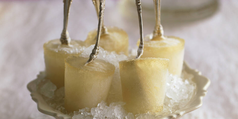 - Die Mischung in kleine Gefäße (z. B. Minijoghurtbecher oder Espressotassen) füllen. Die Gefäße einzeln fest mit Alufolie abdecken. Jeweils in der Mitte eine kleine Öffnung einstechen und kleine Löffel (schön sind Silberlöffel) möglichst gerade hineinstecken, so dass sie von der Alufolie gestützt werden. Das Champagnereis mindestens 8 Stunden, am besten über Nacht einfrieren.