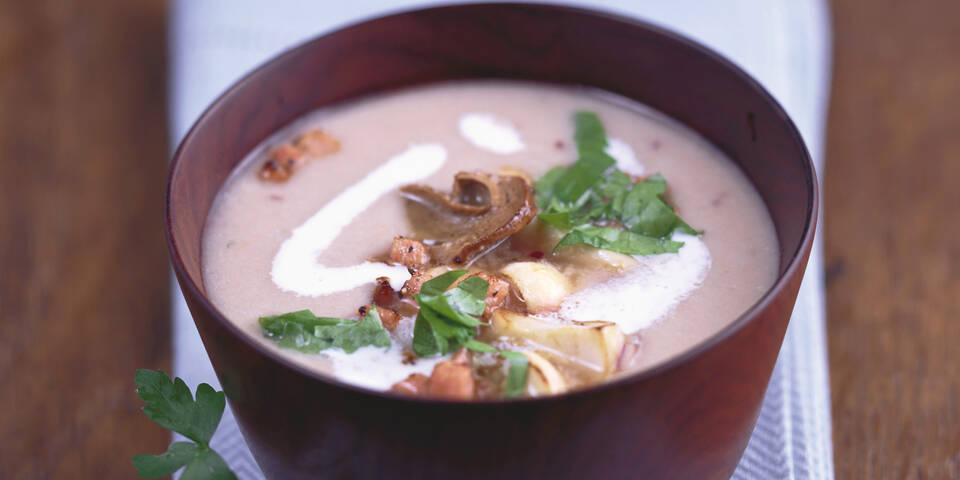 - Crème fraîche einrühren und alles pürieren. Die Suppe mit Salz und Pfeffer abschmecken und auf Schälchen verteilen. Je einen Esslöffel Obers dekorativ aufträufeln, Champignons und Petersilie daraufgeben.