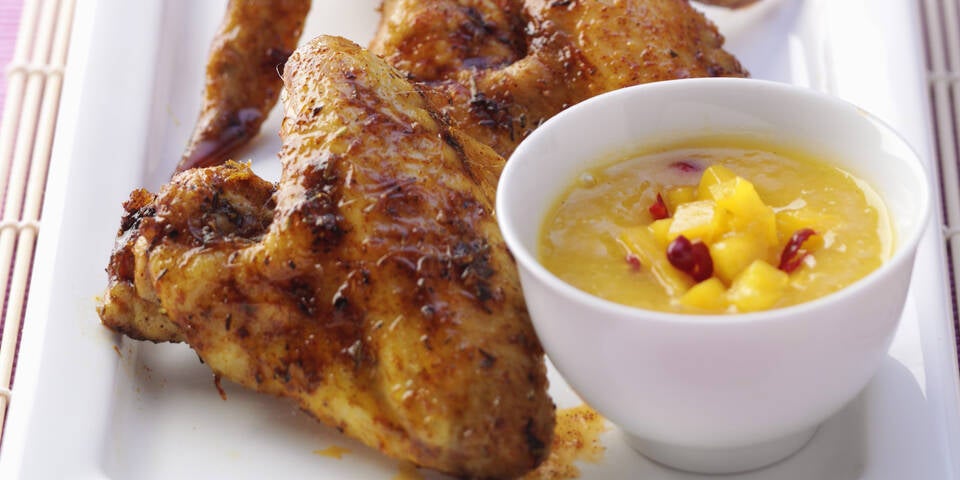 - Währenddessen für die Sauce die Mango schälen, vom Kern schneiden und klein würfeln. Einige Würfel zum Garnieren beiseitelegen. Den Rest zusammen mit dem Zucker und Orangensaft fein pürieren. Jeweils in kleine Schälchen füllen, mit den Mangowürfeln und Chili garnieren und zu den Chicken Wings reichen.