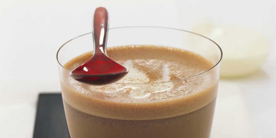 - Die Crème fraîche mit dem Zimt glatt rühren, je einen Klecks auf die Schokolade geben und sofort servieren.