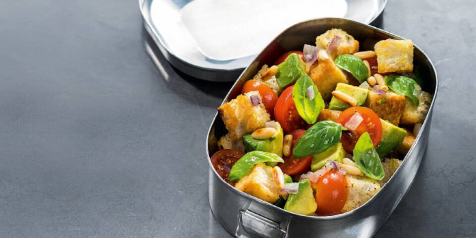 - Die Brotwürfel mit Avocados, Tomaten, Pinienkernen, Zwiebeln, Knoblauch, Basilikum, restlichem Olivenöl und Zitronensaft in eine Schüssel geben und alles vermischen. Mit Salz und Pfeffer abschmecken.