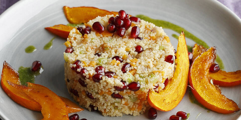 - Die Grantapfelkerne unter den Couscous mischen und mit Salz, Pfeffer und Zitronensaft abschmecken. Mit Hilfe von Garnierringen auf Tellern anrichten, und mit den Kürbisspalten servieren.