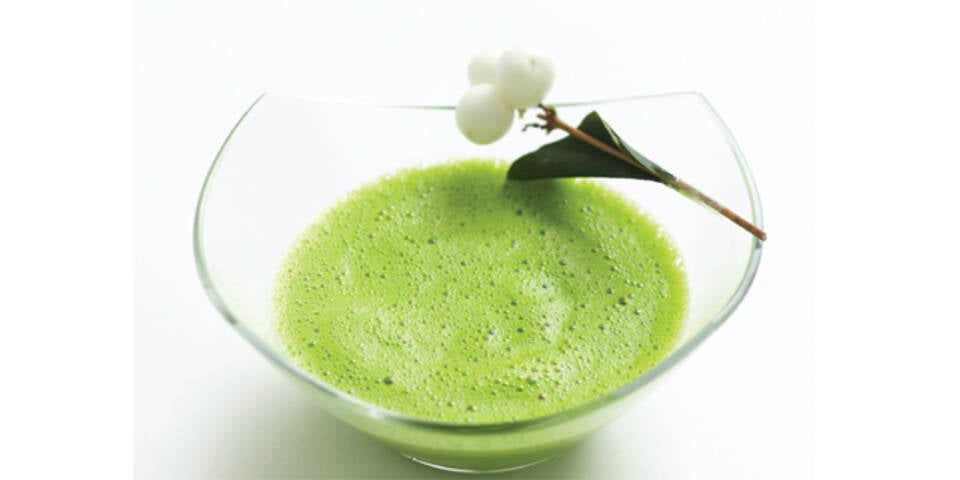 Erbsenschoten überkochen, abseihen, sofort eiskalt abschrecken und abtropfen lassen. Petersilie und Erbsen in die Suppe geben. Suppe pürieren und durch ein Sieb streichen.