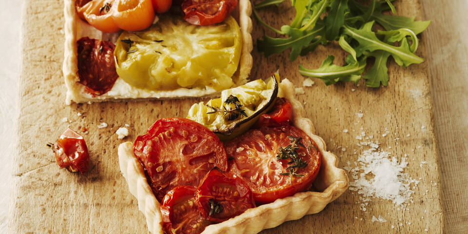 - Den Boden mit der Ricottamasse bestreichen, mit den Paradeisern belegen, leicht salzen, pfeffern, mit Thymian bestreuen und mit etwas Olivenöl beträufeln. Im vorgeheizten Ofen ca. 25 Minuten backen. Herausnehmen und nach Belieben mit Rucola garniert servieren.