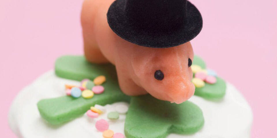 - Mit der Creme bestreichen, je ein Kleeblatt darauf legen, leicht andrücken und mit Zuckerkonfetti bestreuen. Je ein Marzipan-Glücksschwein darauf setzen und servieren.