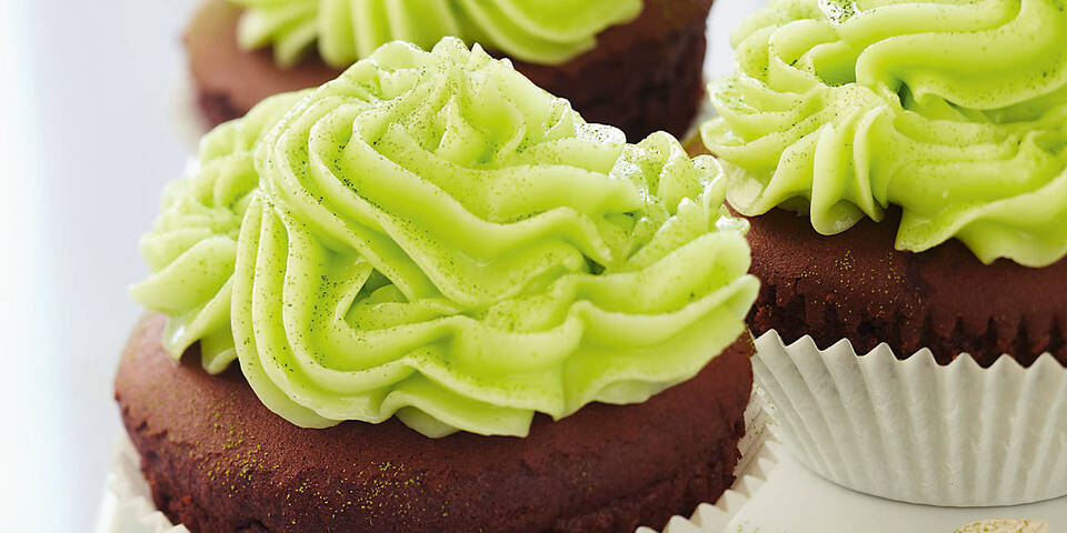 - Die weiche Butter mit dem Staubzucker cremig rühren. Den Frischkäse und Limettensaft unterrühren. So viel Matchapulver nach und nach unterrühren, bis die gewünschte Farbintensität erreicht ist. Die Creme in einen Spritzbeutel mit Sterntülle füllen und auf die Cupcakes auftragen. Mit ein wenig Matcha bestauben und servieren.