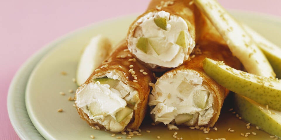 - Inzwischen die Birnen waschen, vierteln und vom Kerngehäuse befreien. Eine Birne in Spalten und die Übrigen in kleine Würfel schneiden. Den Frischkäse mit der Crème fraîche, dem Zitronensaft, dem Zucker und dem Vanillezucker verrühren und die Birnenstücke untermischen. 2 EL der Masse auf einer Palatschinke verstreichen, aufrollen und halbieren.
