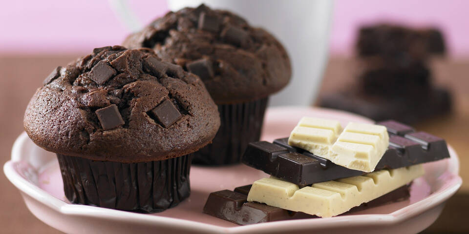 - Den Backofen auf 180 °C Ober- und Unterhitze vorheizen. Die Papierförmchen in die Vertiefungen des Muffinbackblechs setzen. Die dunkle Schokolade über einem heißen, nicht kochendem Wasserbad schmelzen.