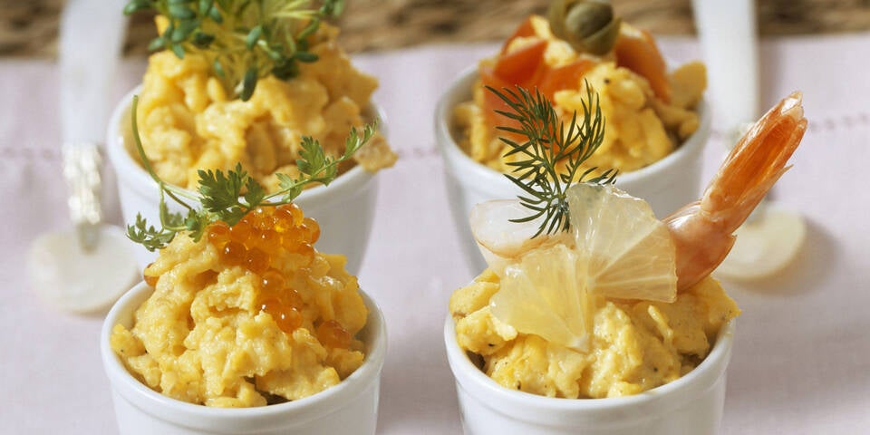 - Die gestockte Eierspeis in die Eierbecher füllen und nach Belieben mit Kresse, Krabben, Kapern, grünem Pfeffer, Kräutern, Tomatenwürfeln, Lachskaviar oder Zitrone garniert servieren.