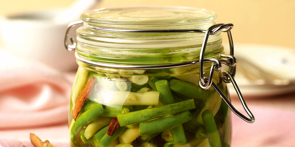 - Die Fisolen waschen, putzen und dickere nach Belieben längs halbieren. In kochendem Salzwasser ca. 8 Minuten blanchieren, abgießen, kalt abschrecken und gut abtropfen lassen. In Einmachgläser einschichten.