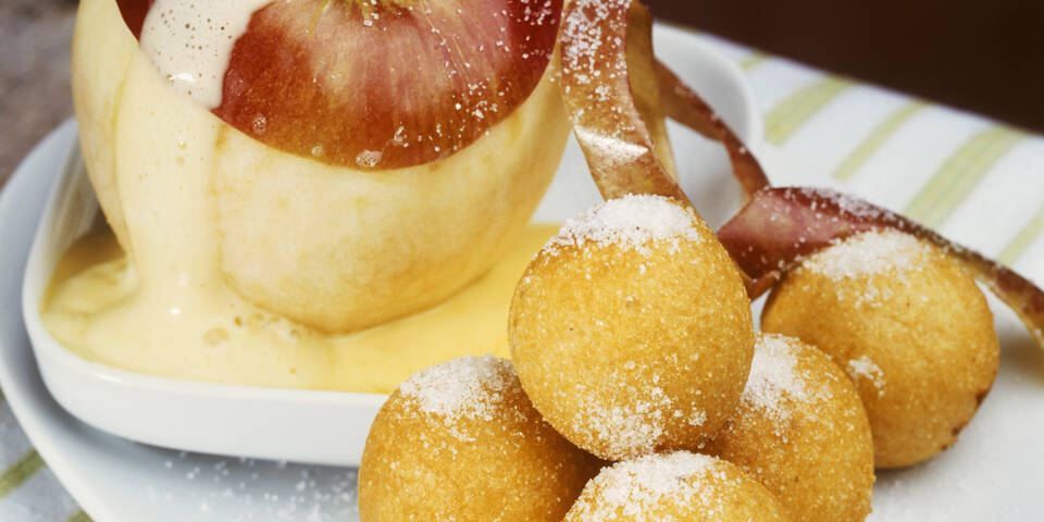 - Äpfel schälen, Kerngehäuse entfernen und fein reiben. Dann Erdäpfel mit den Äpfeln, dem Mehl, dem Zucker und den Eidottern zu einem Teig kneten.