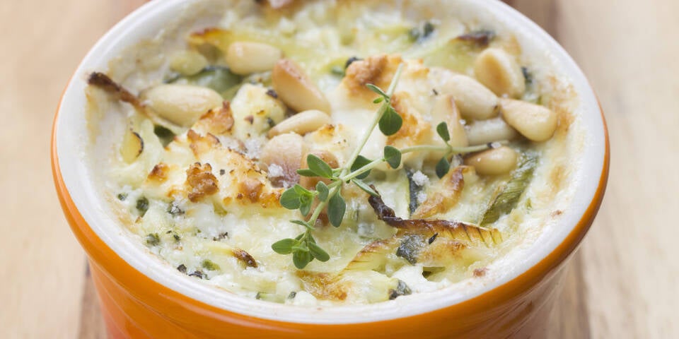 - Den Gemüsefond mit der Crème fraîche und den Eiern mischen. Den Thymian waschen, die Blättchen abzupfen und unter die Crème fraîche-Mischung mengen. 2/3 des Mozzarella untermengen. Mit Salz und Pfeffer würzen. Unter die Erdäpfel-Fisch-Mischung mengen und in kleine ausgebutterte Auflaufförmchen verteilen. Mit dem restlichen Mozzarella und den Pinienkernen bestreuen. Im Ofen ca. 20 Minuten gratinieren.
