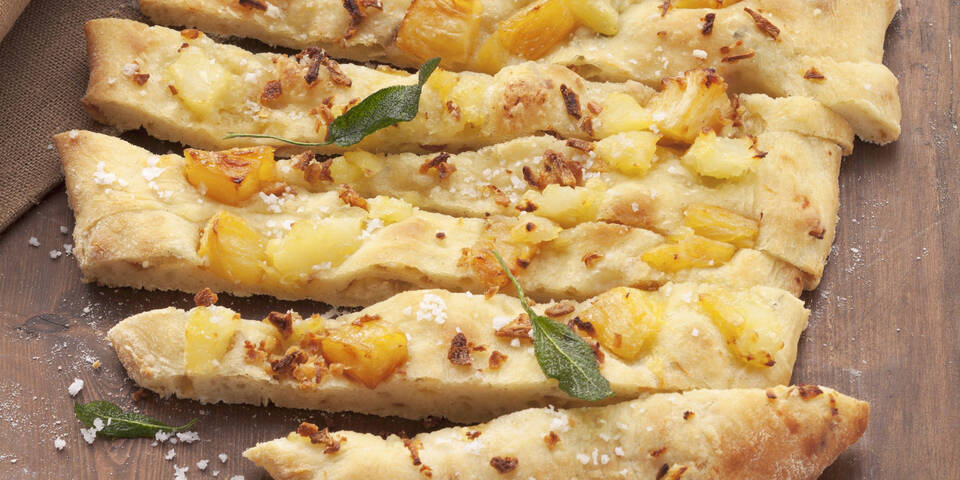 - Den Backofen auf 220 °C Ober- und Unterhitze vorheizen. Den Erdäpfel-Hefeteig auf bemehlter Arbeitsfläche nochmals gut durchkneten, etwa 1/3 der Ananas unter den Teig kneten und zu einem Fladen formen (ca. 2 cm dick). Auf ein mit Backpapier belegtes Backblech legen und mit den übrigen Ananasstücken sowie den Röstzwiebeln belegen. Im vorgeheizten Ofen ca. 30–35 Minuten goldbraun backen. Den Salbei im übrigen Öl ausbraten. Das Fladenbrot aus dem Ofen nehmen, mit dem Salbei sowie dem Meersalz bestreuen und in Stücke geschnitten servieren.