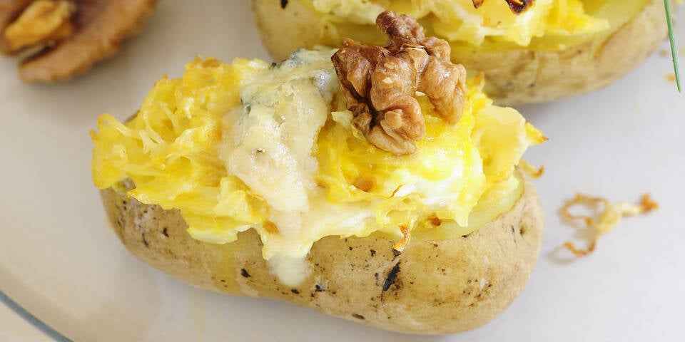 - Bei den Erdäpfeln einen Deckel abschneiden, mit einem Teelöffel etwas aushöhlen. Das Innere mit dem Sauerkraut vermengen und wieder auf die Erdäpfeln geben. Den Käse und je eine Walnusshälfte darauf setzen. Die gefüllten Erdäpfel in eine Auflaufform setzen und im Ofen 5 Minuten bei 180 °C überbacken. Je vier Erdäpfel auf Tellern anrichten.