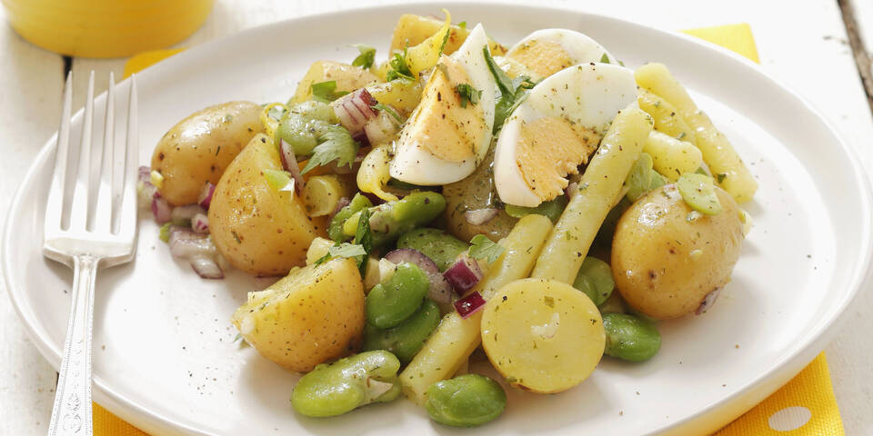 - Die Erdäpfel mit den Bohnen, Kräutern und der heißen Marinade mischen, zwanzig Minuten ziehen lassen. Senf und das restliche Öl sowie den übrigen Essig unterrühren. Salzen, pfeffern, die Eier vorsichtig untermischen und auf Tellern angerichtet servieren.