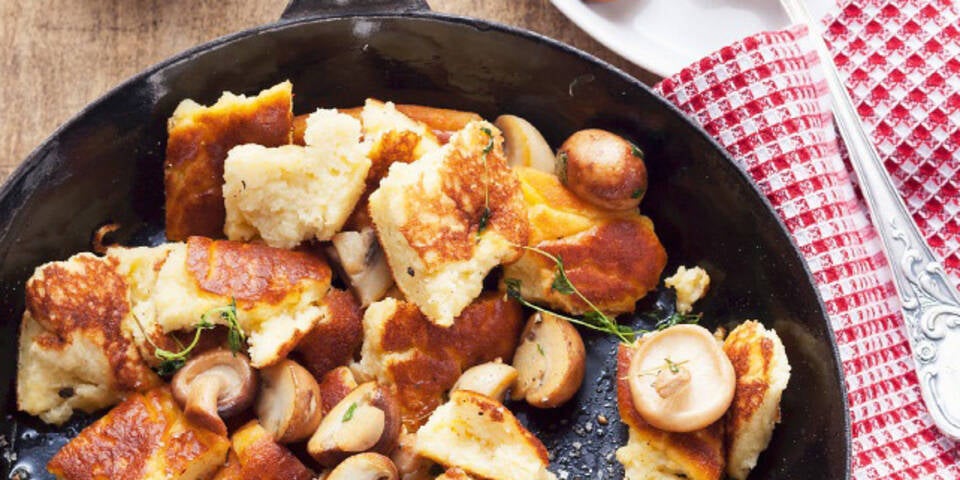 - Für den Schmarrn etwas Schmalz in einer weiteren Pfanne erhitzen. Erdäpfelteig 1 cm dick in die Pfanne geben. 3 Minuten braun anbraten, wenden, zweite Seite anbraten, mit dem Pfannenwender in kleine Stücke zerreißen und die Pilze untermischen.
