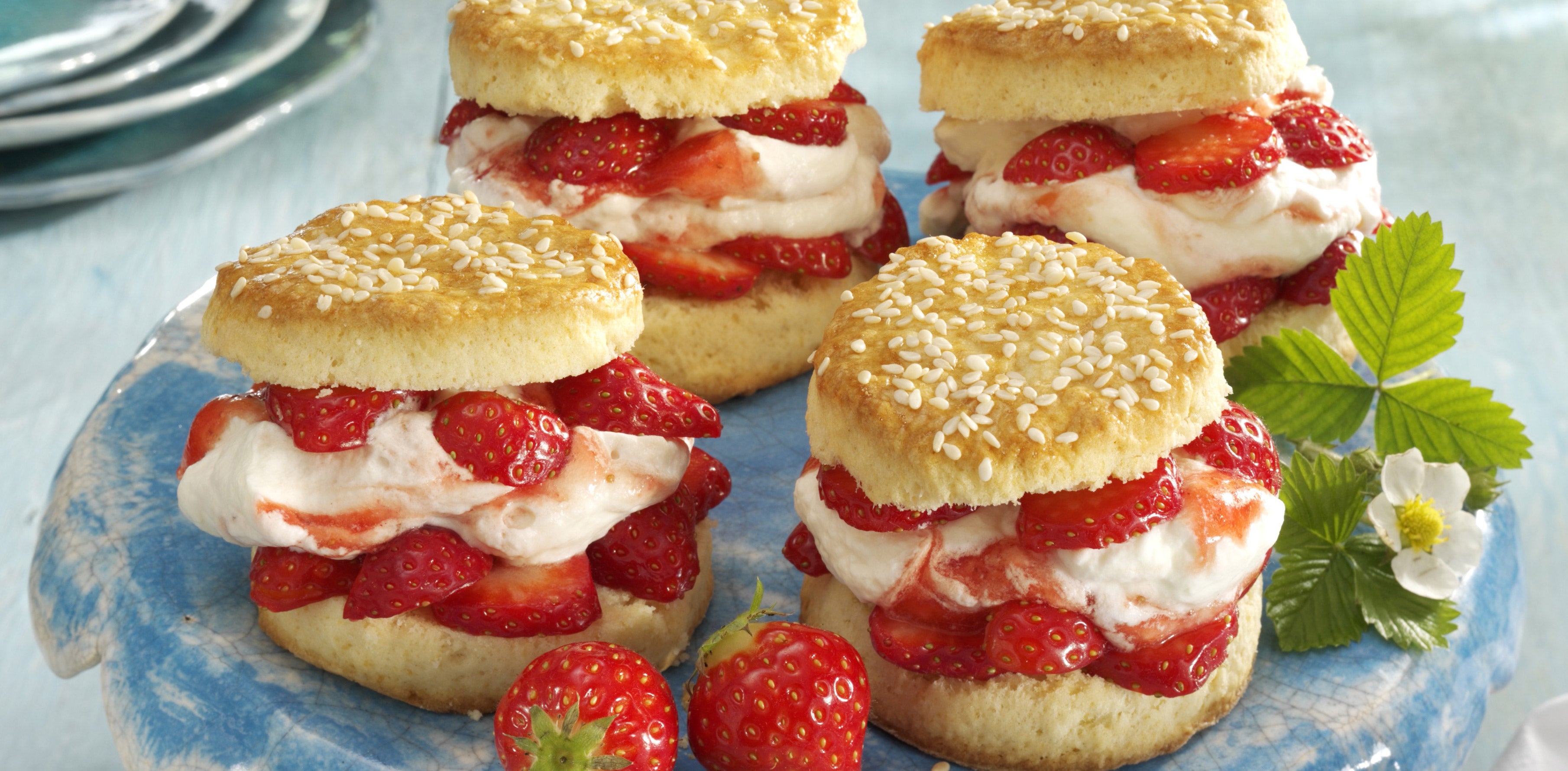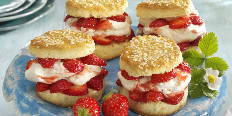 - Die pürierten Erdbeeren unterziehen. Die Hälfte der Erdbeeren auf den Unterseiten der Biskuits (ohne Sesam) verteilen. Das Obers darauf setzen und mit den übrigen Erdbeeren belegen. Die Deckel auflegen und servieren.