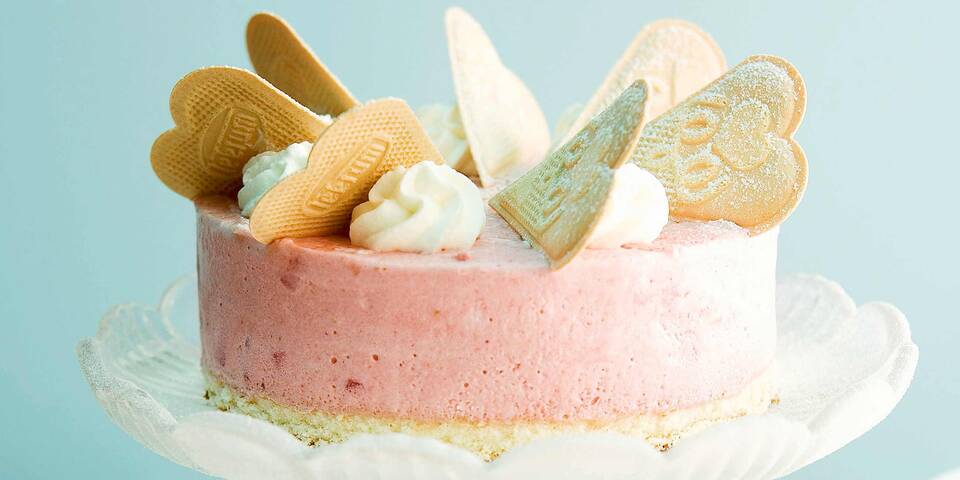 - Die Erdbeereismasse in die Form füllen und mindestens 6 Stunden, besser über Nacht, frieren lassen. Etwa 10 Minuten vor dem Servieren aus dem Gefrierfach nehmen, den Rand und das Papier abziehen und mit nach Belieben mit Oberstupfern und Eiswaffeln garnieren.