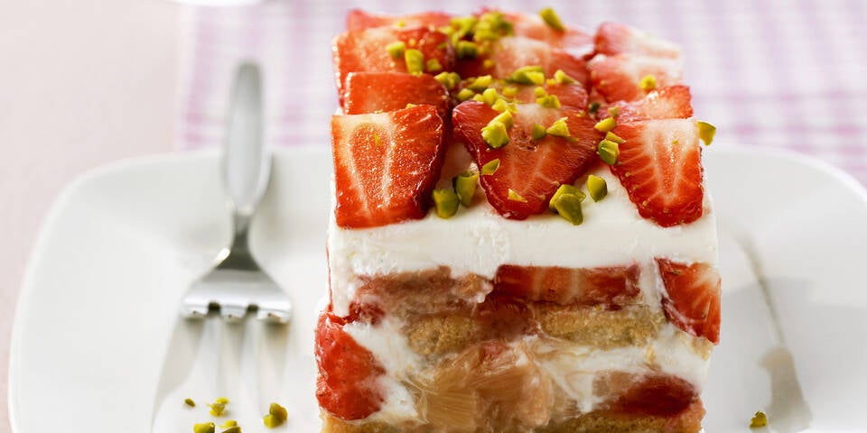 - Ebenfalls 1/3 der Masse draufgeben, Vorgang zweimal wiederholen, mit Creme abschließen, glatt streichen. Mit Erdbeerscheiben schuppenartig belegen und mit Pistazien bestreuen. Kalt stellen und mindestens eine Stunde ziehen lassen. In Stücke schneiden und servieren.